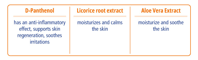 Licorice and Aloe Extracts contained in the formula soothe and moisturize the skin and protect it from dryness.