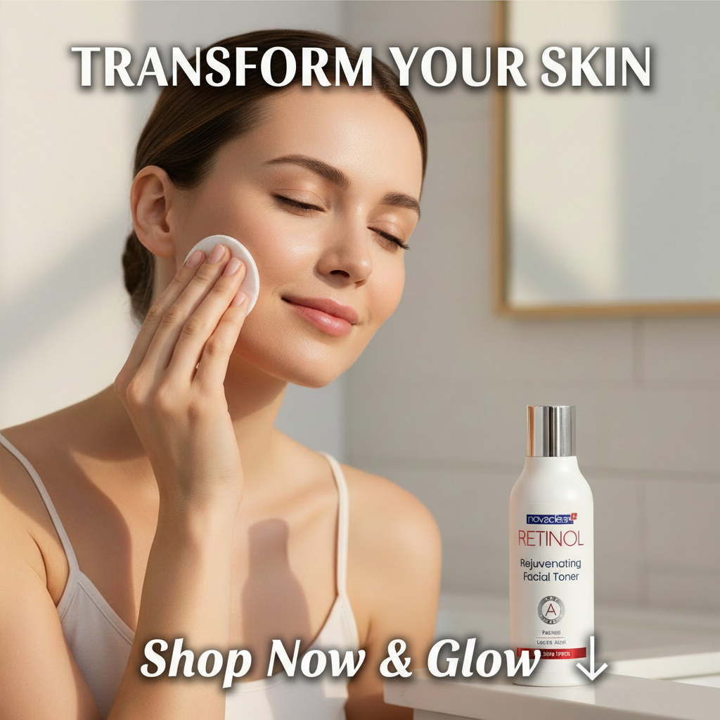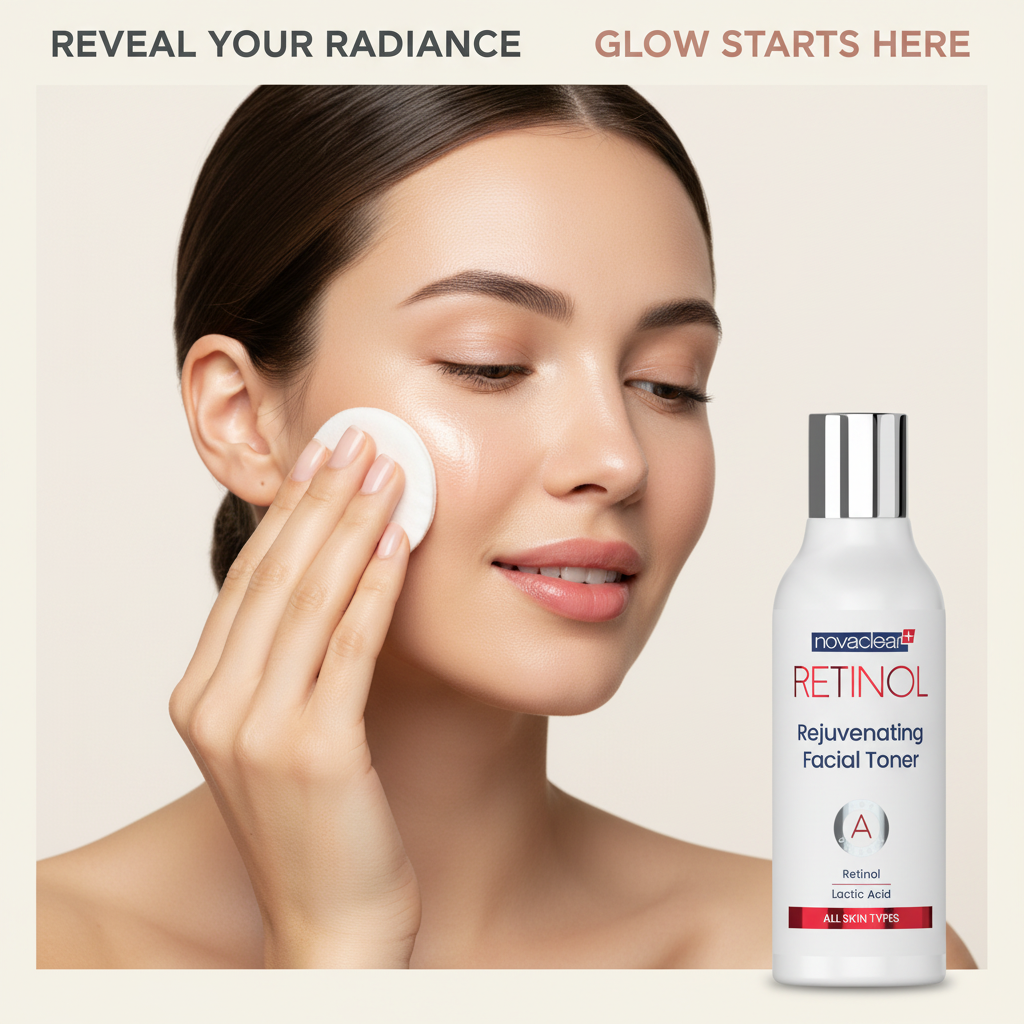 Woman applying facial toner with a bottle of novadene Retinol toner on a beige background.