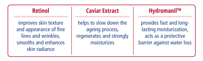 Caviar Extract – helps to slow down the ageing process, regenerates and strongly moisturizes.